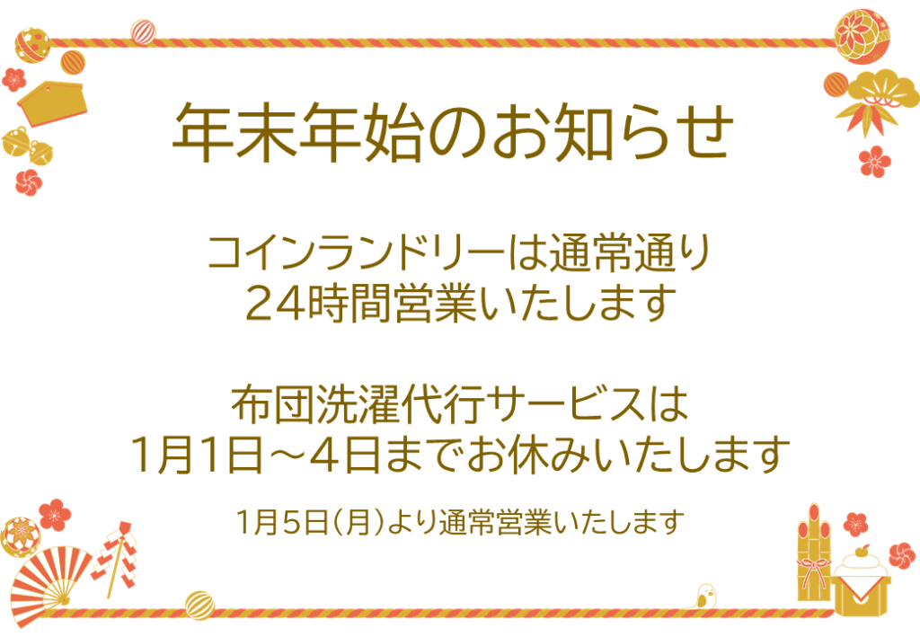 布団の洗濯代行サービスは、1月1日から4日までお休みいたします。