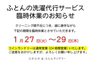 ふとん洗濯代行サービスのお休みのお知らせ 2026年1月13日 最終更新日時 : 2026年1月13日 nozaki 1月27日(火)~29日(木)までクリーニング師不在につき「ふとん洗濯代行サービス」を臨時休業させていただきます。なお、当日はスタッフの常駐はしませんが、店内の清掃はいつも通り行います。よろしくお願いいたします。