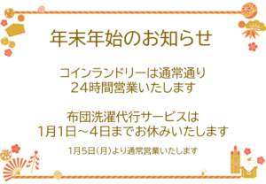 コインランドリーは通常通り24時間営業します。布団の洗濯代行サービスは、1月1日から4日までお休みいたします。1月5日(月)より通常営業いたします。店内の清掃作業は毎日行いますので安心してご利用ください。 2026年もよ […]