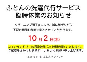 10月2日(木)はクリーニング師不在のため「ふとん洗濯代行サービス」を臨時休業させていただきます。なお当日はスタッフの常駐はいませんが店内の清掃はいつも通り行いますので、コインランドリーは通常通りご利用いただけます。